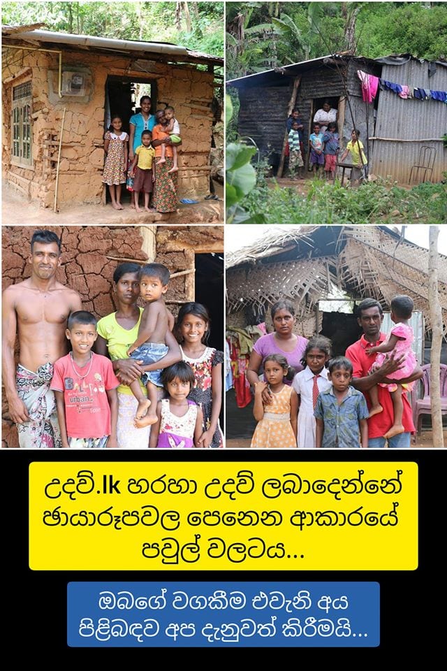 මේ ඔබ දකින්නේ පසුගිය වසර 6 තුල අප ෆේස්බුක් මිතුරන්ගේ උදව්වෙන් නිවාස සාදාදුන්, ස්වයංරැකියා ලබාදුන්, පාසල් උපකරණ, වියළිආහාර හා මාසික දීමනා ලබාදුන් පවුල් 1,000 ගණනක් අතුරින් කිහිපයකි.