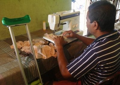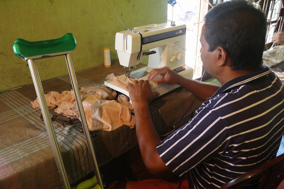 මේ ඉන්නේ අජිත් බන්දුල (51), අනුරාධපුර, ශ්රාවස්තිපුර ඉන්නේ. ඉන්නේ කුළී ගෙදරක. බිරිඳ රම්යාලතා (48) දරුවෝ 3 දෙනෙක් ඉන්නවා. බුමාල් (අවුරුදු 3), පසන් (2 වසර), සචින්ත (4 වසර). මේ දරුවන්ගේ පියාට ස්නායු ආබාධයක් නිසා ඇවිදින්න බැහැ. ඒ වගේම ඔහුට දියවැඩියාව. ඒත් එහෙම කියලා නිකන් ඉන්න බෑනේ. බිරිඳත් එක්ක එකතුවෙලා බොහොම අමාරුවෙන් රෙදි ගෙනත් ඇඳුම් මහලා කඩවලට දානවා. ඔහුට කකුලෙන් පාගන්න බැරි නිසා අතින් පාගන මැෂිමකින් තමා වැඩ කරන්නේ.